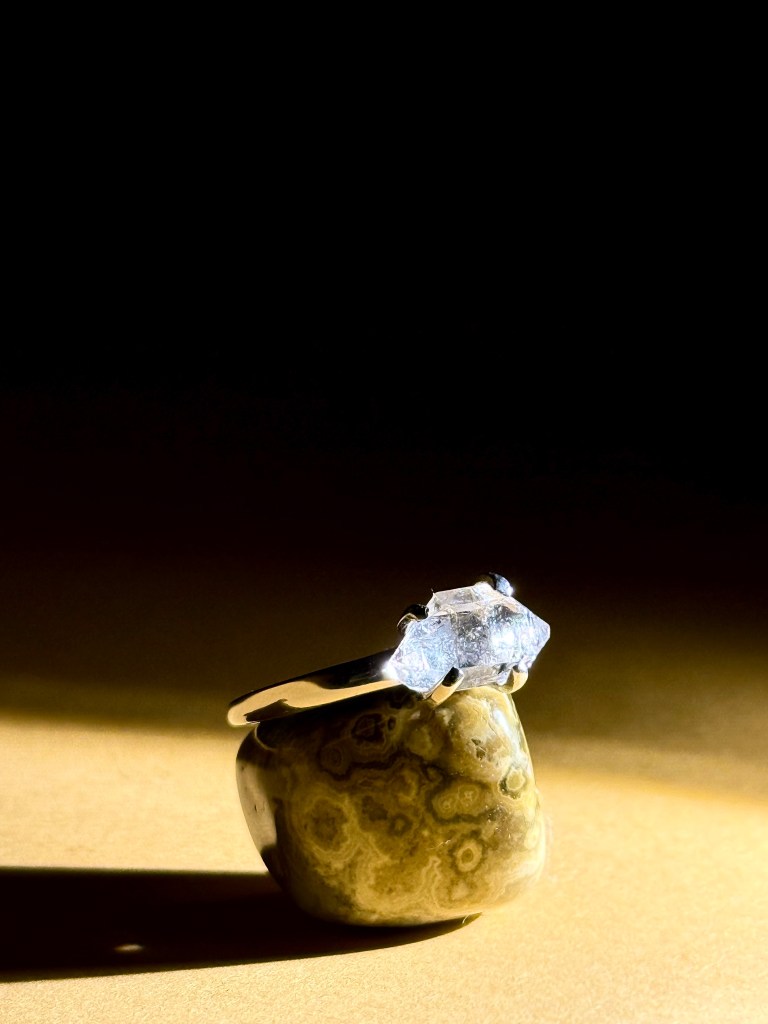 ANDH-01: Base in Argento s925 con incastonato al suo interno un Diamantino di Herkimer (Quarzo Ialino) famoso per la sua doppia terminazione e originario dello stato di Herkimer in USA.