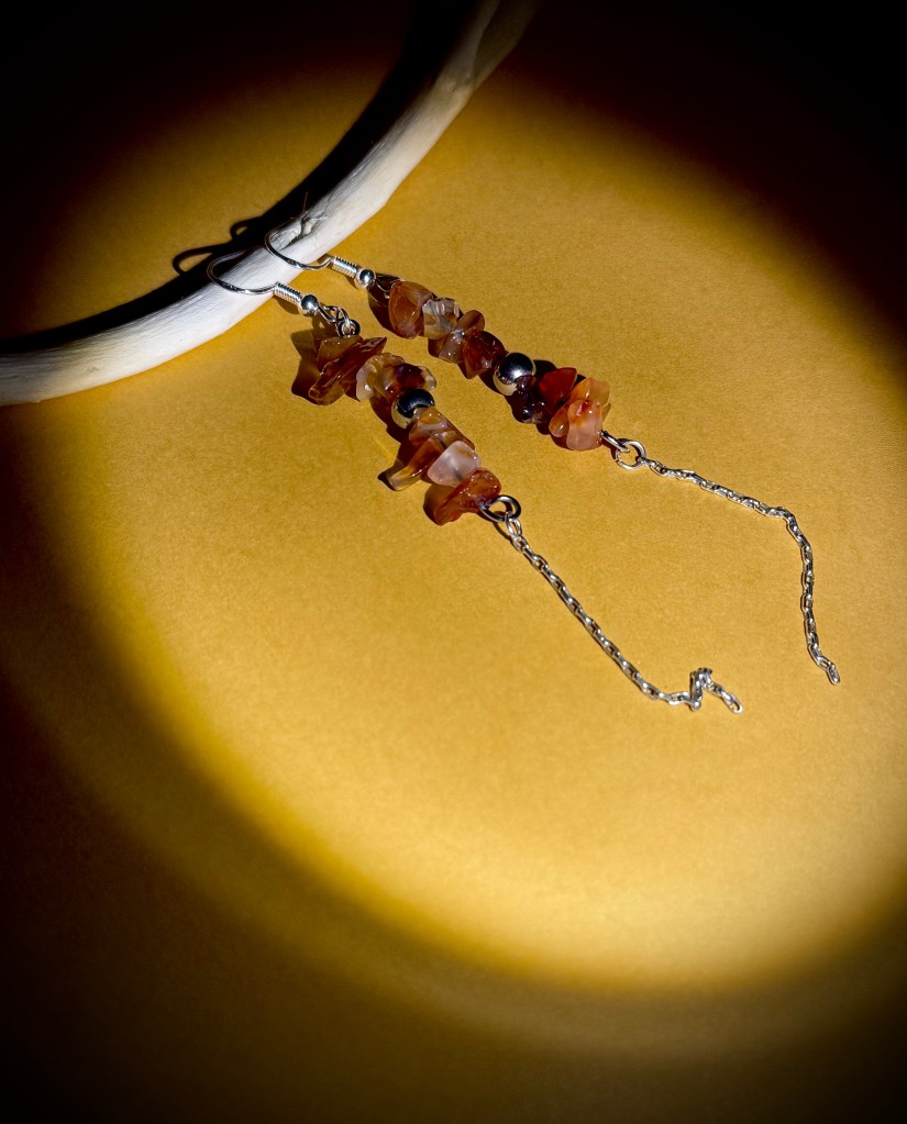 Orecchini in Argento s925 con inserti di Corniola grazia e perla in acciaio inox. La sua lunghezza e di 10 cm. totali, dalla Monachella alla fine della catena. Il tutto agganciato da una barra interna in acciaio inox.
